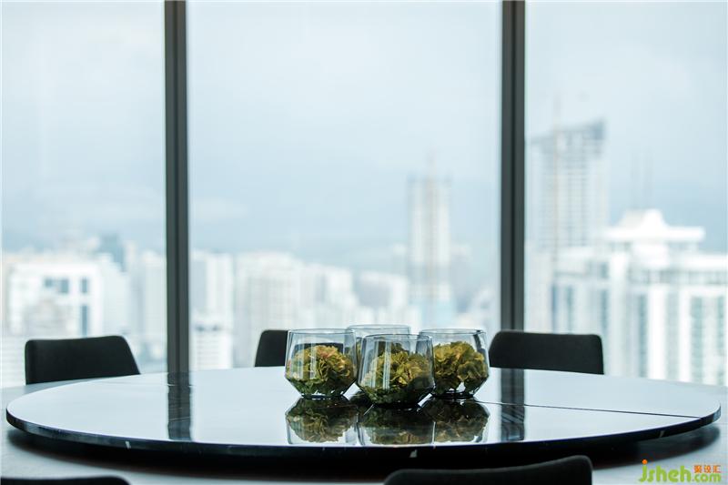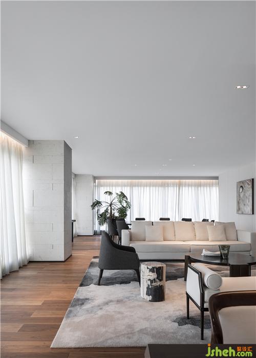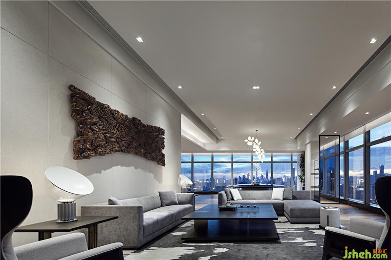 素樸的木藝,經(jīng)由現(xiàn)代工法的演繹,成為極具當代氣質(zhì)的墻面藝術裝置,搭配淺色調(diào)布藝沙發(fā)、水珠狀藝術燈飾,呈現(xiàn)出純粹而有序的空間氣度??臻g的純凈與窗外深圳的都市景觀形成對話,設計師以獨特的視角凝注天幕之上此時此刻的曼妙,予人以獨特的觀感。