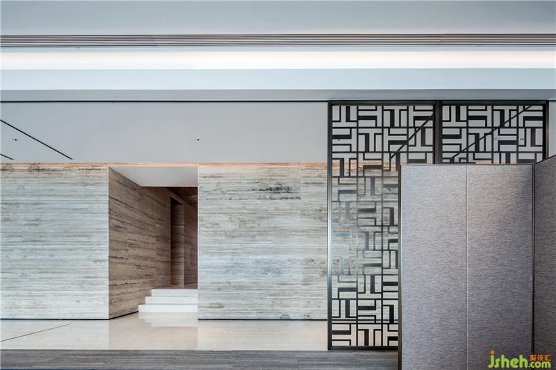 挑高天花上,是光影瀲滟的水波紋,與云紋墨痕的大理石墻面相互映襯,在樸拙與精細的對話中,寫意流動的藝術,描摹生動的意境。
