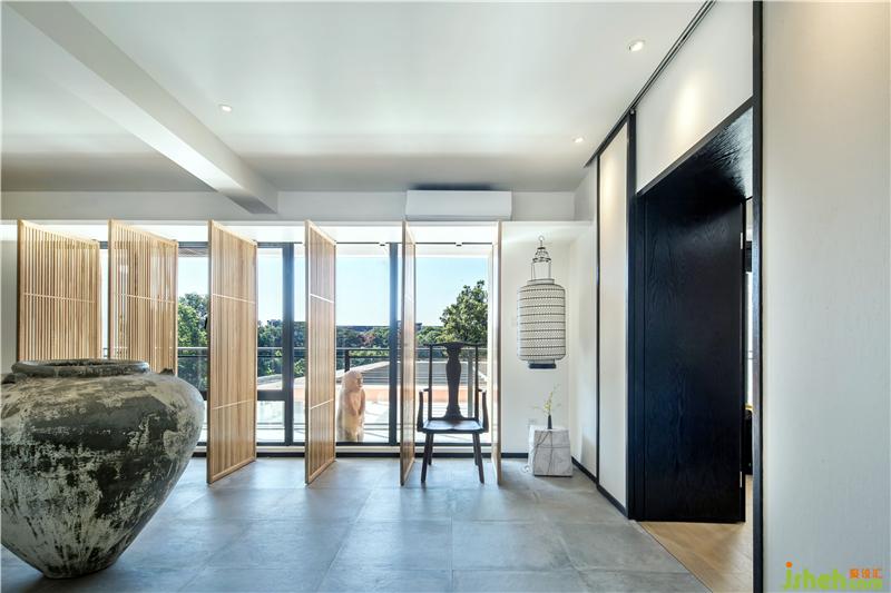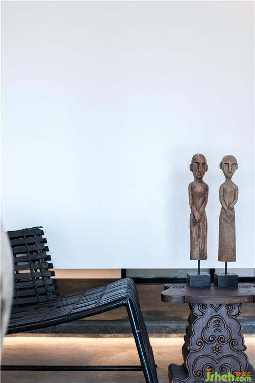 在這一方天地,扇扇淺木質(zhì)屏風(fēng),將明亮的光線過濾成斑駁闌珊的光影;古樸的深口大缸,在輕盈空間中壓下深沉的一筆,將視覺焦點(diǎn)和氣場(chǎng)濃縮凝聚在中央。古董雕塑肅穆而立,鐵藝燈籠墻邊低掛;烏木層疊秩序井然,綠意蔥蔥點(diǎn)綴其中。深藤淺麻,交織成趣;灰石青磚,古而不拙。是已,觀者漫步其中,步步皆景,禪意自如。