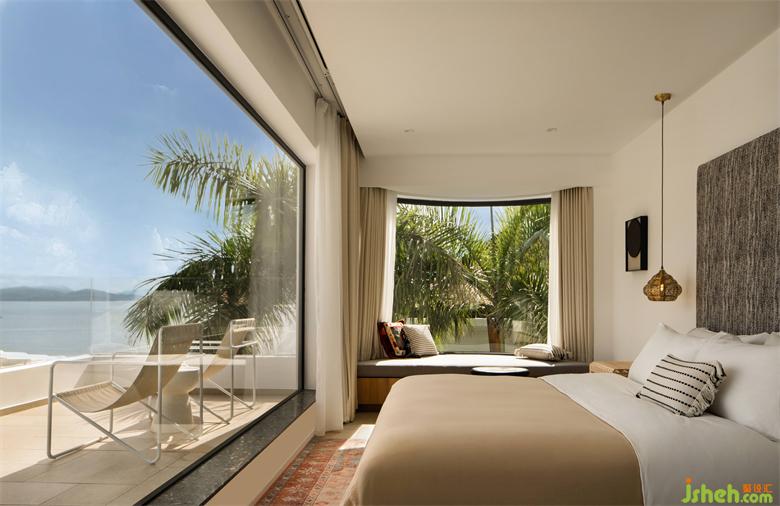 每個人都會有 POWER OFF 的至暗時刻,也會向往短暫的逃離。度假酒店設(shè)計而設(shè)計的本質(zhì),在功能性和情感之間尋求一個平衡,讓使用者在被主題化的空間里找到自我認同。從進入房間的瞬間,迎面而來是碧波的無限包容。通過大面積落地開窗,將環(huán)境的生動觸感引入到室內(nèi),窗外的山海與綠蔭爭先恐后地跳脫到面前,鮮活而美好。