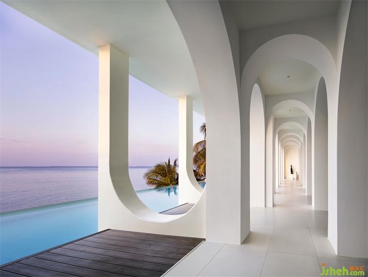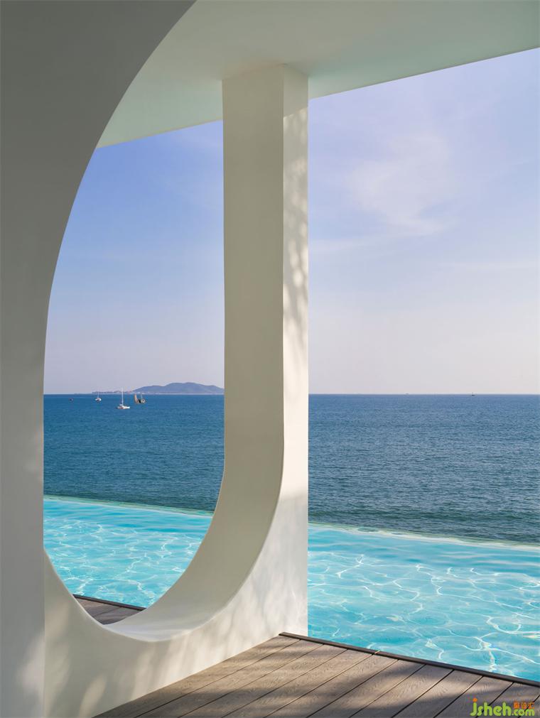 從無(wú)邊泳池延伸出去,精品酒店設(shè)計(jì)當(dāng)視線(xiàn)觸及純白與碧藍(lán)的無(wú)形銜接處,人的知覺(jué)和想象自然而然地轉(zhuǎn)移至天臺(tái)之上。