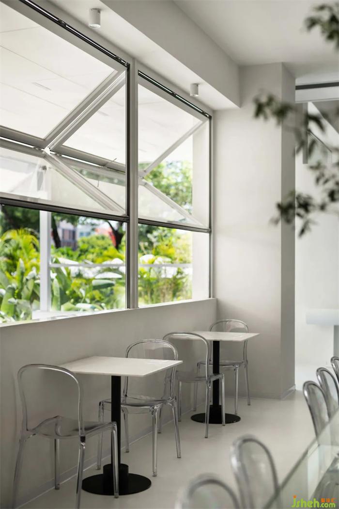 室內(nèi)空間以大面積的白色充斥兩個方盒空間的嵌套結(jié)合關(guān)系,并通過高差打造垂直緯度的豐富體驗(yàn)。對于當(dāng)代都市人群的生活預(yù)設(shè),咖啡不僅代表了一種生活態(tài)度,更是一種工作方式的延續(xù)。餐廳設(shè)計對于冗雜工作間的厭倦,使得人們轉(zhuǎn)向?qū)で蟾辛己皿w驗(yàn)的空間。