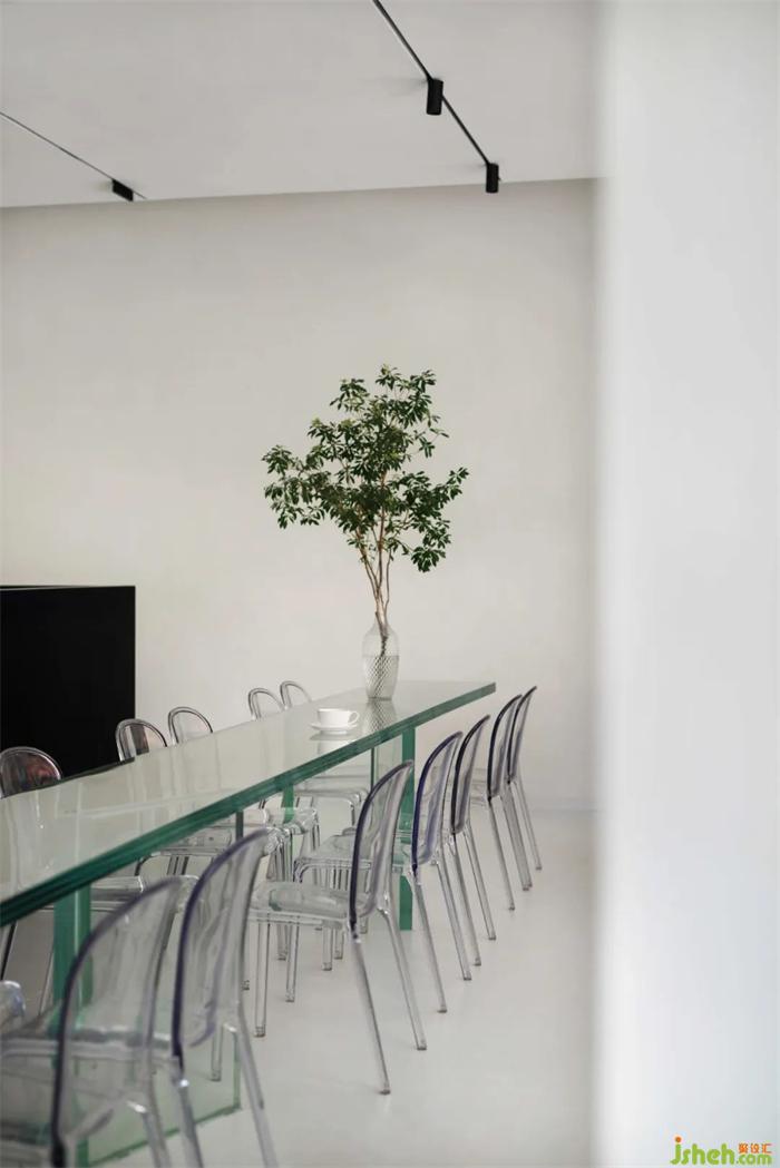 主空間中央的玻璃長桌,通體透明的硬朗形體透露著工業(yè)時代的冷峻與嚴(yán)謹(jǐn),味匠咖啡廳設(shè)計而亞克力椅子的柔和曲線中和了其中的疏離,使得人們共處方式更加開放多元。人們可以在這里視頻會議、活動交流,充分表達(dá)自我,聯(lián)通外部世界。