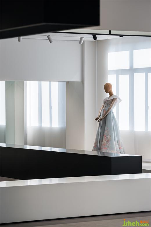 基于WANG FENG產(chǎn)品系列的婚紗和禮服兩大類別,禮服展廳設(shè)計(jì)使用空間體塊穿插的手法,自然勾勒出兩大展示體系的聚焦??v橫交錯(cuò)的體塊陣列,消解了傳統(tǒng)櫥窗展示的秩序,讓品牌更自由、更近人。