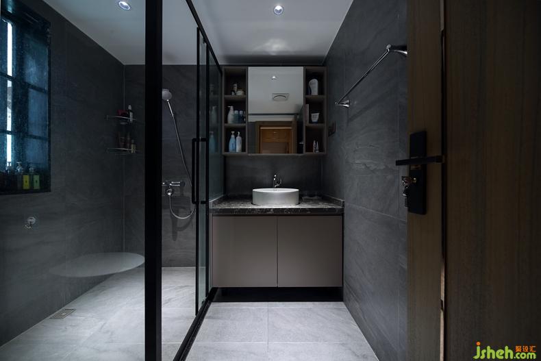 衛(wèi)生間黑白灰的色彩高級神秘猶如黑珍珠的光芒一樣深邃,深圳室內(nèi)設(shè)計師用玻璃隔開洗浴、洗漱臺以及馬桶,整個規(guī)劃充分利用了每一寸面積。