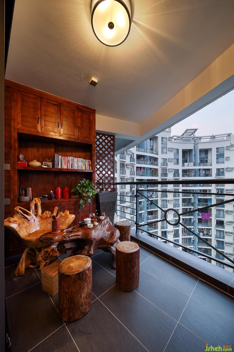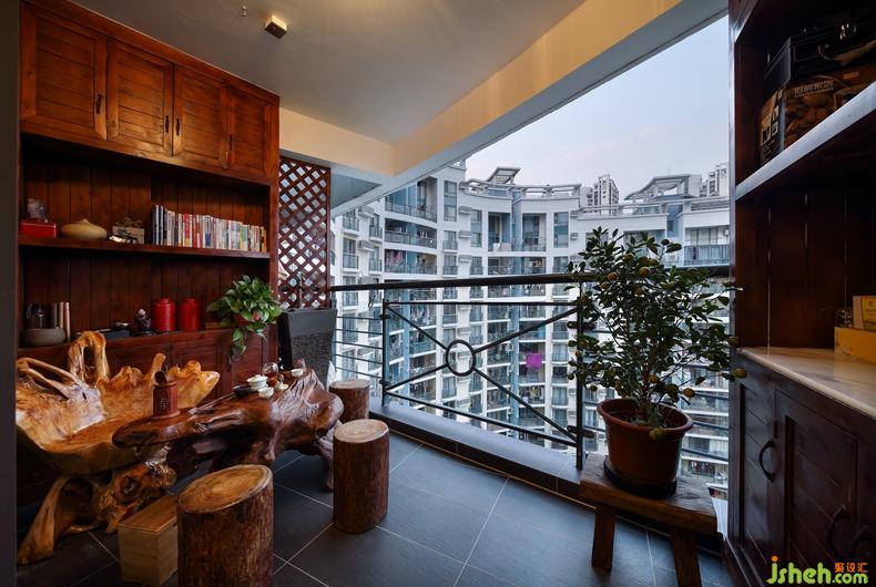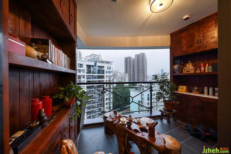 業(yè)主是熱愛中國文化的人自然也是一個茶癡,景觀陽臺被改做一個小小的茶室,左右兩邊的實(shí)木柜子擺滿主人的收藏的好茶,一樽樟木木頭做成的精致的茶桌,一張?jiān)煨涂鋸埖膿u曳木頭椅子閑來無事,燒水煮茶,可邀親友共嘆、同賞窗外風(fēng)景也可自己一人享受這靜謐時光,人生如此,夫復(fù)何求!