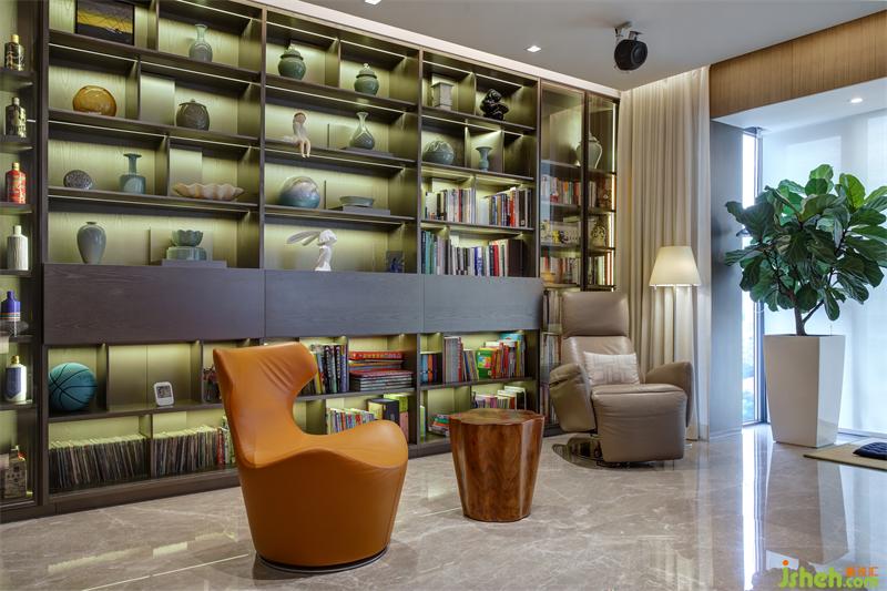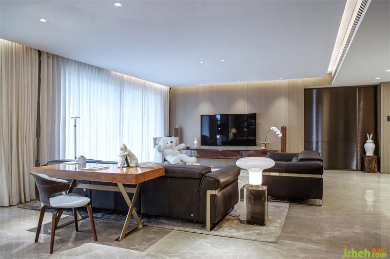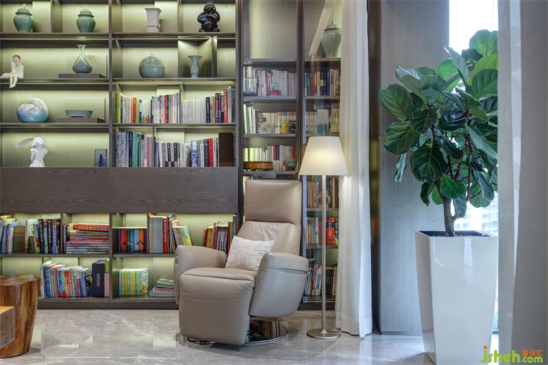 為開闊空間,設(shè)計師改造原始結(jié)構(gòu),將書房與客廳打通,拉伸了客廳的整體空間。