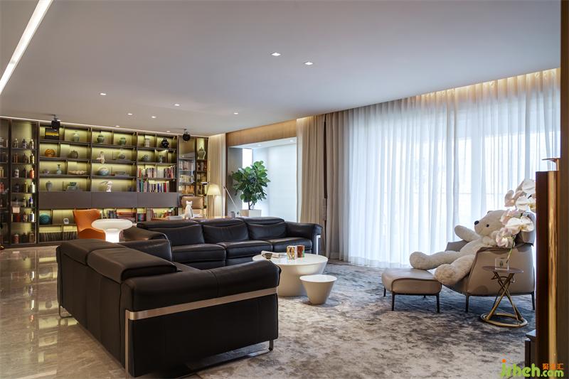 這個區(qū)域設(shè)計為集儲物、工作、閱讀為一體的多功能區(qū)。半開放半封閉的木質(zhì)陳列柜占據(jù)了整片墻面,除書吧的作用外,深圳豪宅設(shè)計師希望為主人的收藏愛好打造一個展示空間,藏酒、藏書及瓷器雕塑等工藝品在此都可以得到全面的收納與展示,與相鄰極簡設(shè)計的休