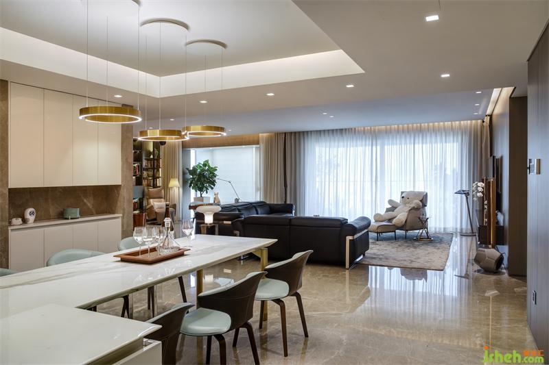 餐桌選擇六座西式餐桌,采用白色大理石臺面和金色啞光噴漆桌腿,搭配霧霾藍皮質(zhì)餐椅,整體清新淡雅的色調(diào)使畫面明亮整潔,深圳豪宅設(shè)計照明采用與桌腿相呼應(yīng)的啞光金屬不閉合環(huán)形吊燈,三燈錯落有致。一側(cè)的內(nèi)嵌式水吧和儲物柜滿足儲物和生活需求。