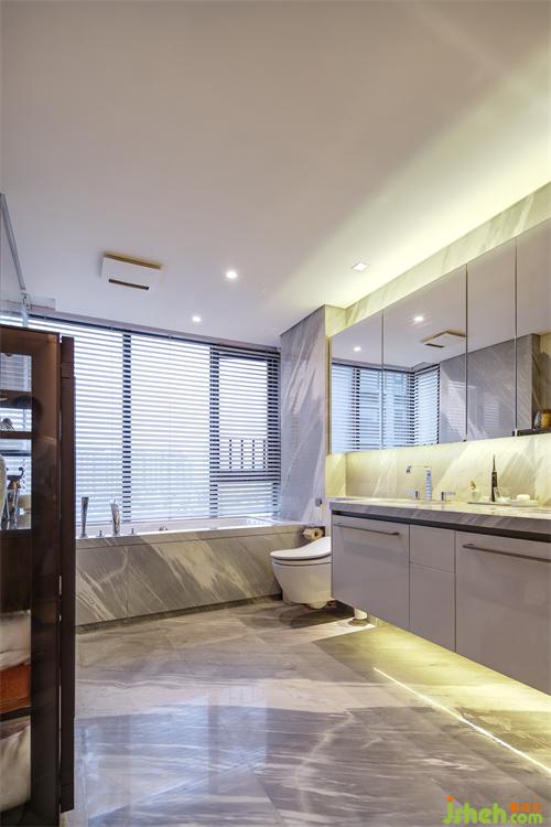 深圳豪宅設(shè)計師采用與墻體及地面一體設(shè)計的浴缸及懸掛馬桶,貫徹極簡的設(shè)計風(fēng)格,避免了難以清潔的尷尬,更能保證衛(wèi)生。