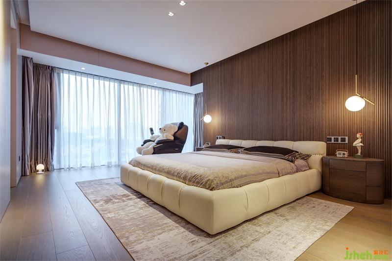 主臥延續(xù)客廳的黑白灰棕主色調,但采用了更加溫暖的配色。設計全景落地窗讓視角更加開闊,希望幫助主人在忙碌生活中調劑心情。