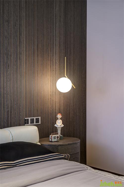 黑灰色細條紋酸枝木貼面墻前對稱的窗前吊燈及床頭柜配色統(tǒng)一而不乏味,球形吊燈適用臥室柔和的整體氛圍需求,雙聯(lián)開關設計避免了主人日常起居不必要的麻煩。
