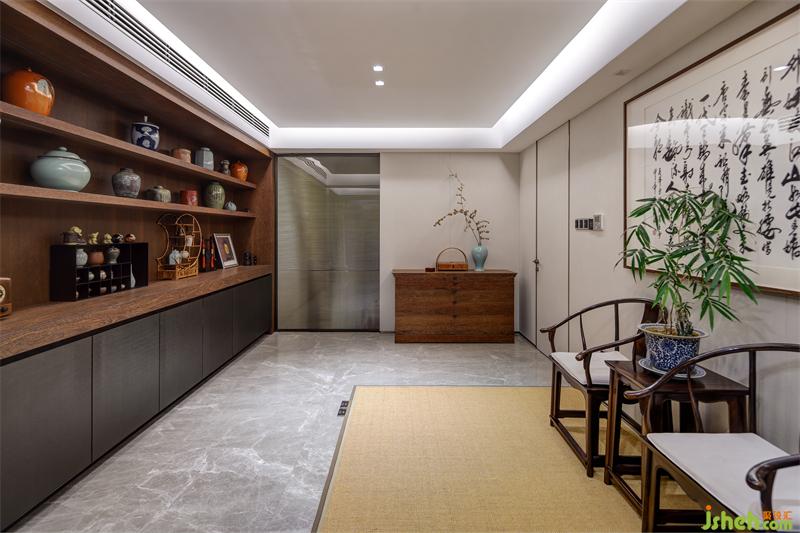 拉絲玻璃作為茶室與走廊的隔斷既保證了隱蔽性又不顯拘束,茶室內大面積采用草木元素,適應書房的整體調性。設計師在一側墻面設計展示柜,希望將業(yè)主的各式工藝收藏品得以展示,與對側墻面懸掛的大幅書遙相呼應,彰顯主人品味。草編地毯上的檀木太師桌椅與落地窗前的寫字桌適合主人伏案工作,也適合與三兩客人商談閑聊。