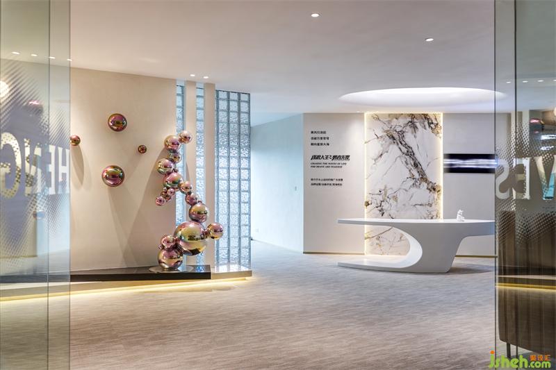 該公司主營(yíng)水上運(yùn)動(dòng)的推廣發(fā)展,所以,我們?cè)谠O(shè)計(jì)的時(shí)候,也會(huì)考慮到一些契合主題的元素。比如:我們將前臺(tái)打造成波浪形狀,增加空間的流線美感,讓整體更加的柔和 ,極具親和力。柔光似水的設(shè)計(jì)感,便由此及彼。