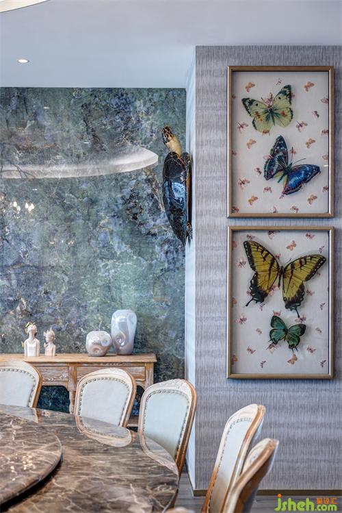 明朝的呂紀(jì)有一幅名畫《杏花孔雀圖》,描繪了孔雀長(zhǎng)尾垂地,棲息引頸張望,而一旁的古杏正開(kāi)得熱鬧,深圳辦公室設(shè)計(jì)花枝交相輝映的美況。我們將古畫的美還原出來(lái),讓空間多了幾分古色古香的意蘊(yùn)。配合墻上的藍(lán)色蝴蝶裝飾物,更添幾分詩(shī)意韻味。