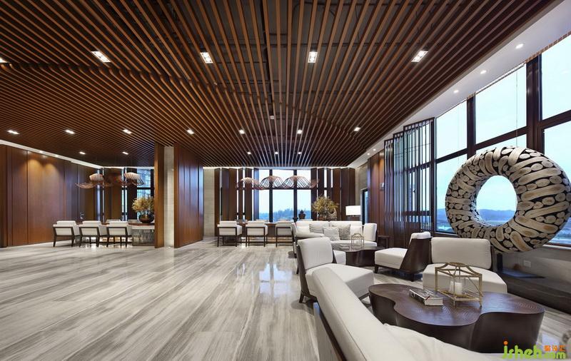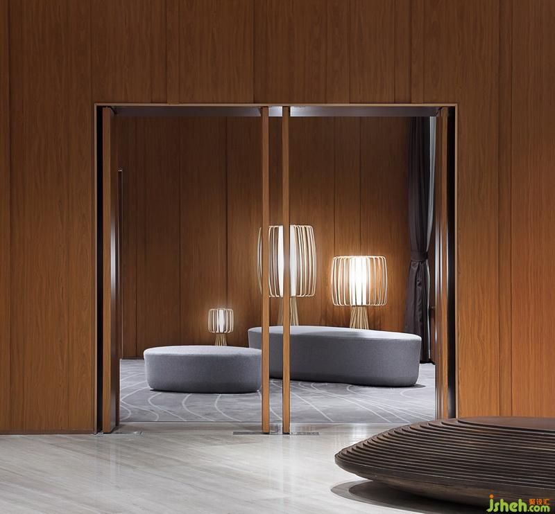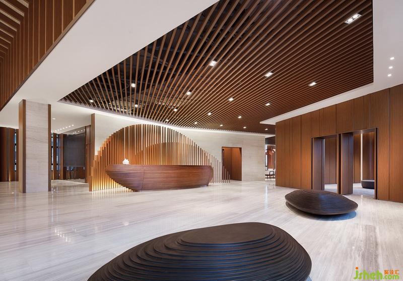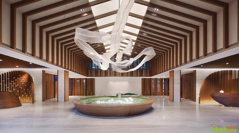 在表現(xiàn)空間的過程中,“況陽春召我以煙景,大塊假我以文章”成為設計方在表現(xiàn)形式上的指導思想。在平面布局注重空間的開合關系,在空間效果上則注重建立一個大與小,疏與密,繁與簡相對應,有節(jié)奏感的空間秩序。因此室內設計師在建立室內空間秩序的同時,利用一條可塑材質創(chuàng)作的裝置在大堂中央部分形成舞動的狀態(tài),打破空間因對稱的平衡和材質的秩序感可能造成的呆滯感,由視覺的層面產(chǎn)生靈動的感受。它是整部樂曲中需要流露的靈魂。