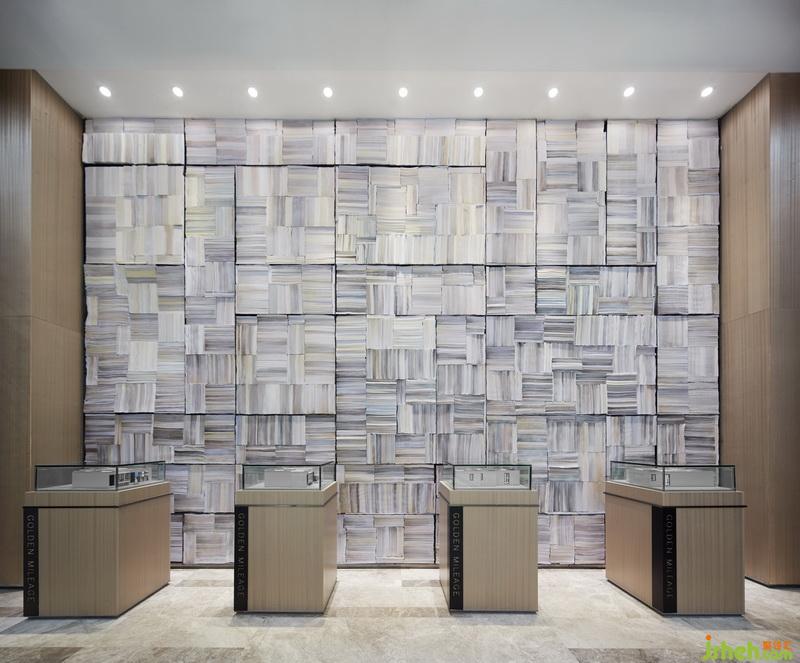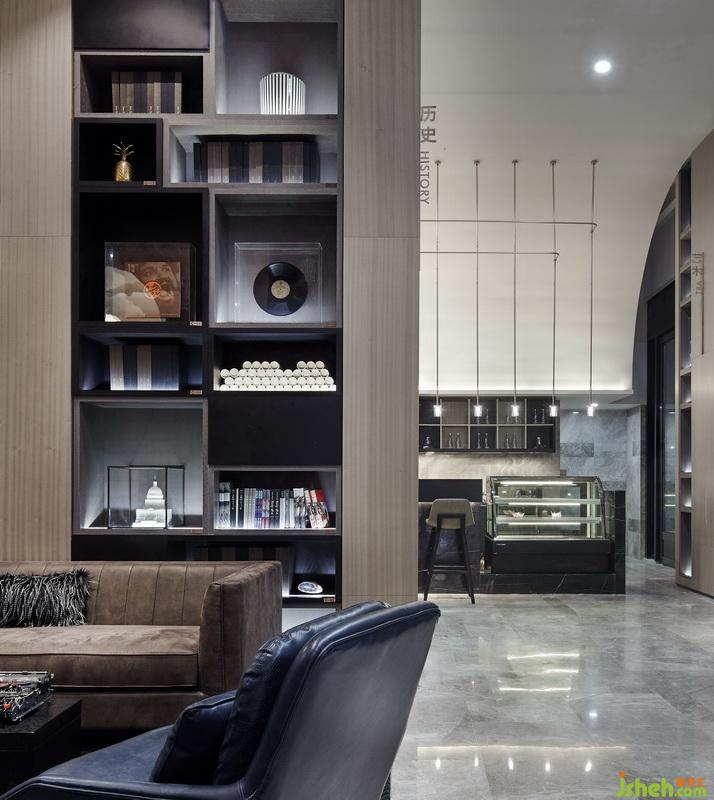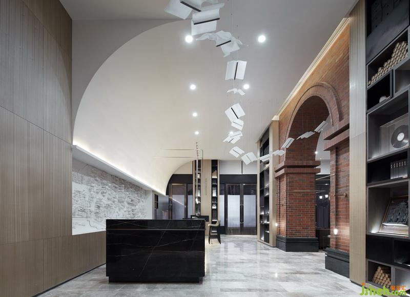 主要材料:木飾面、拼色古堡灰大理石、劈開磚、古銅色不銹鋼、黑色氟碳漆
