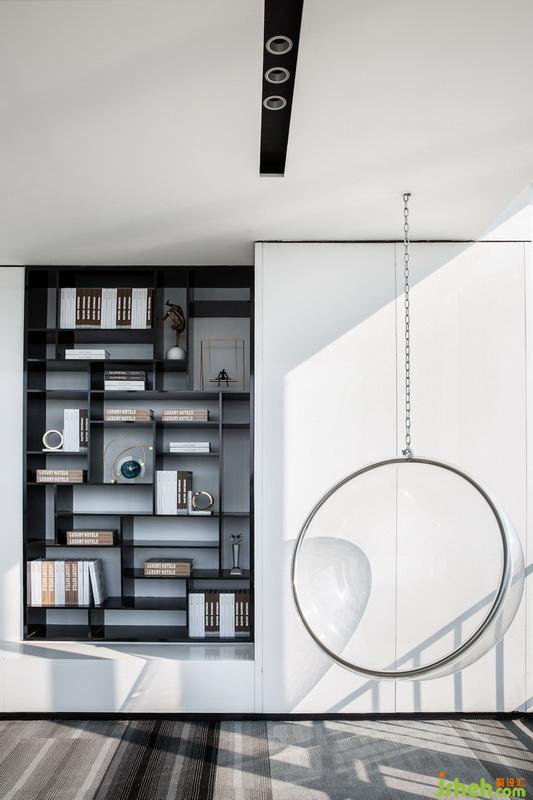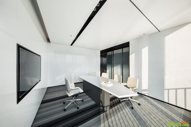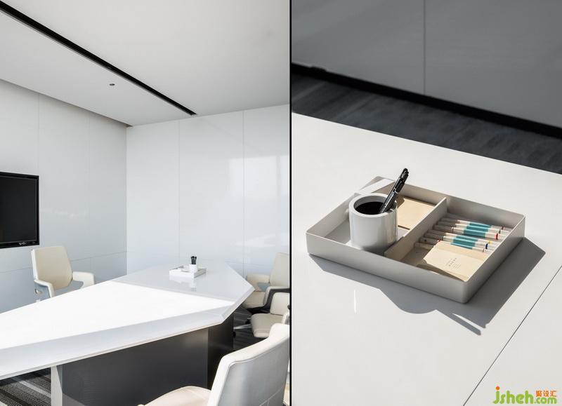 作為立意的基點(diǎn)“天光云影”并不能生硬的搬到室內(nèi)。同時(shí),把窗外景色盡可能引入到每一個(gè)辦公位又成為設(shè)計(jì)的課題。作為辦公空間的常態(tài),不到一定層級(jí),大抵都是終日向隅一隅。設(shè)計(jì)師深諳其苦。綜合環(huán)境和人文的需要,在呈現(xiàn)空間狀態(tài)的設(shè)計(jì)中,設(shè)計(jì)師不糾纏于瑣碎,而是大刀闊斧利用重新建構(gòu)的框架的基礎(chǔ)面形成的線條作展開。在色調(diào)上,設(shè)計(jì)師以白為基調(diào),以材質(zhì)賦予其形成微妙的異同狀態(tài),利用光的變化和重顏色的點(diǎn)線豐富空間形態(tài)。設(shè)計(jì)師在設(shè)計(jì)過程中,將空間當(dāng)作一個(gè)素而稍顯斑斕的觀景空間加以考慮,使用適量的綠植穿插其間,以與戶外天然作情態(tài)上的呼應(yīng)。在空間結(jié)構(gòu)重新整合之后,呈現(xiàn)出抬頭即眺遠(yuǎn),在使用者心理層面喚起“天光云影”的印象,調(diào)節(jié)使用人士在該空間的心理狀態(tài)。