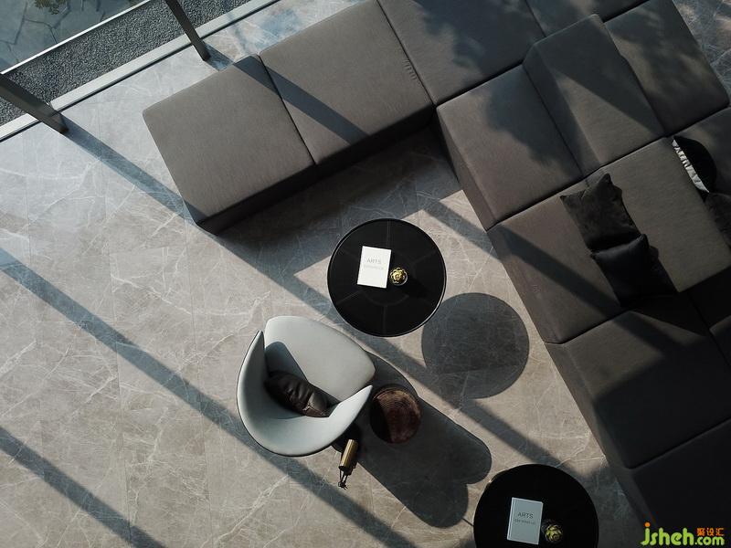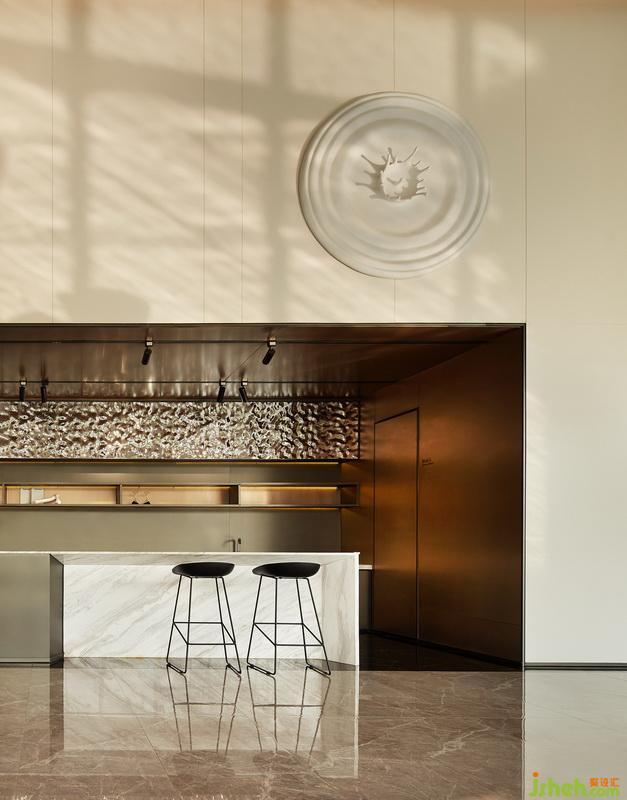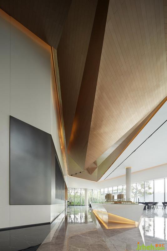 設(shè)計(jì)師認(rèn)為從一個(gè)面延伸出兩條路可以走——由天花這個(gè)面,往外則與戶外自然環(huán)境和景觀相銜接;向內(nèi)則成為整個(gè)空間中吸引人注意的部分,從而使之成為一條起伏流暢的設(shè)計(jì)線索貫穿整個(gè)空間。