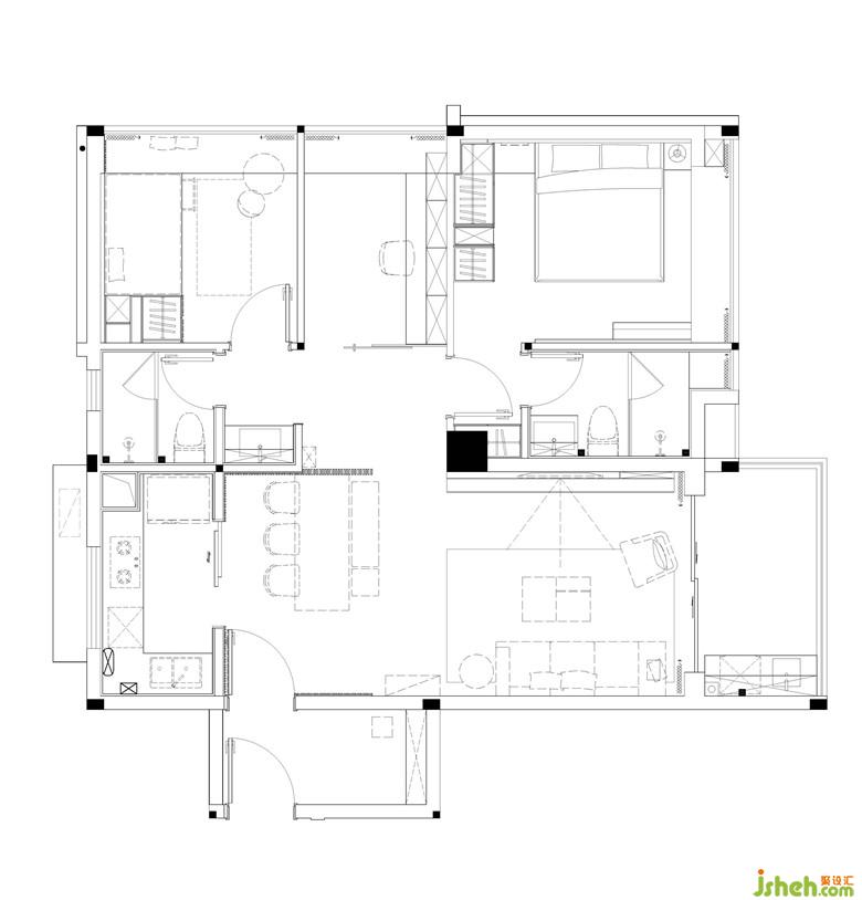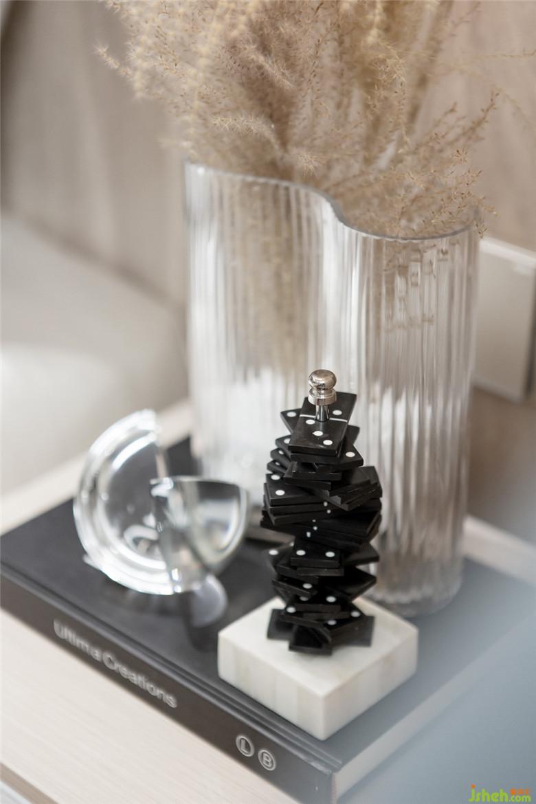 白色棉麻與不同質(zhì)感的灰度交織,并適時(shí)融入淡淡的灰藍(lán)絨面質(zhì)感,穿插少量黑色線條,材質(zhì)和色彩之間輕柔過(guò)渡。