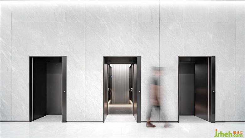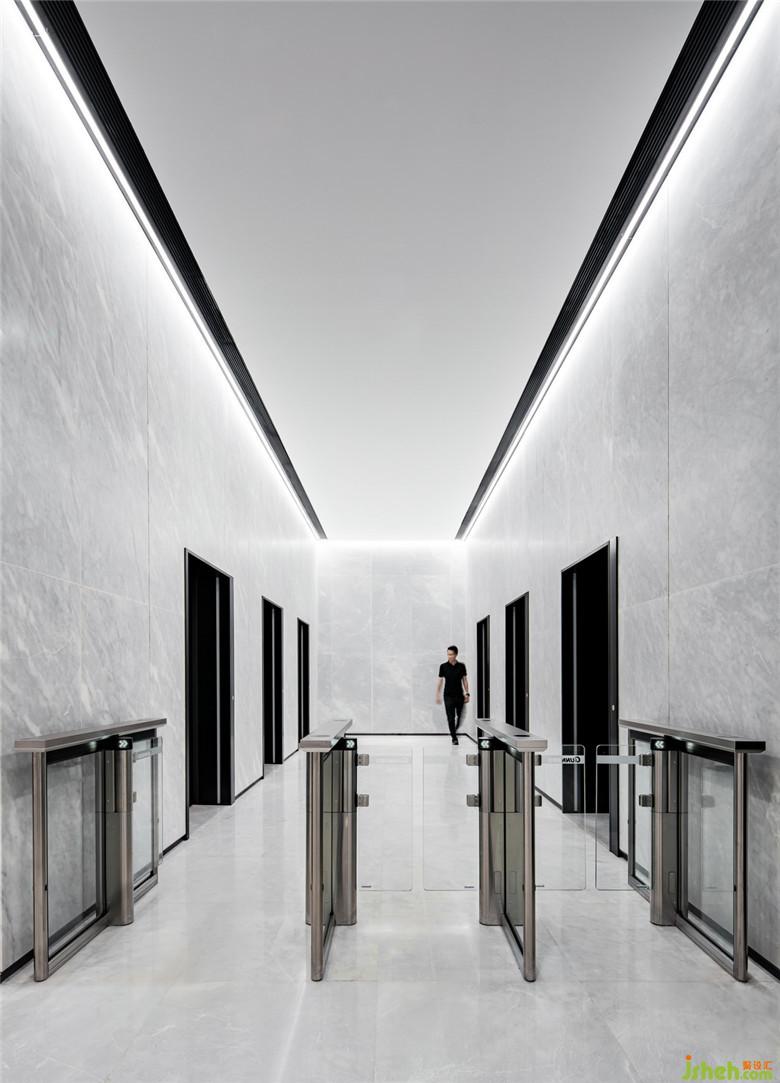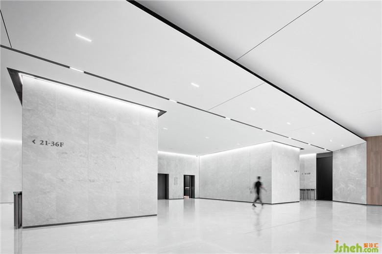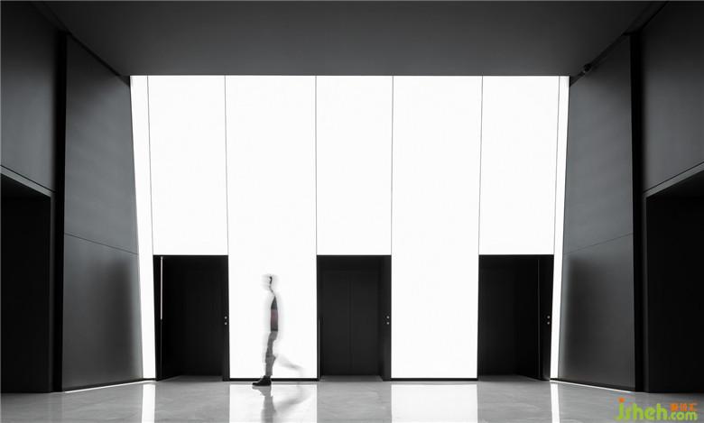 在五樓的商務(wù)大堂里,一塊下沉的獨(dú)立空間被隱藏在大堂前臺(tái)的背后,特殊位置使得這個(gè)場(chǎng)域可以將等待的到訪人員完美的“躲”在里面,保證接待區(qū)域的整齊有序。在整個(gè)商務(wù)空間體系中,它就像緊湊的動(dòng)線上的一個(gè)緩沖區(qū),在內(nèi)與外之間提供一個(gè)可長(zhǎng)時(shí)間停駐的人性化區(qū)域。大量木質(zhì)元素的應(yīng)用讓這里顯得更加溫和柔軟,營(yíng)造出舒緩的歇息與交談氛圍,這一切也因?yàn)榭臻g的下沉被極好地隱藏在大堂的“高冷”調(diào)性之中。