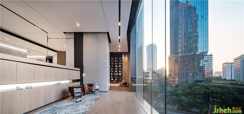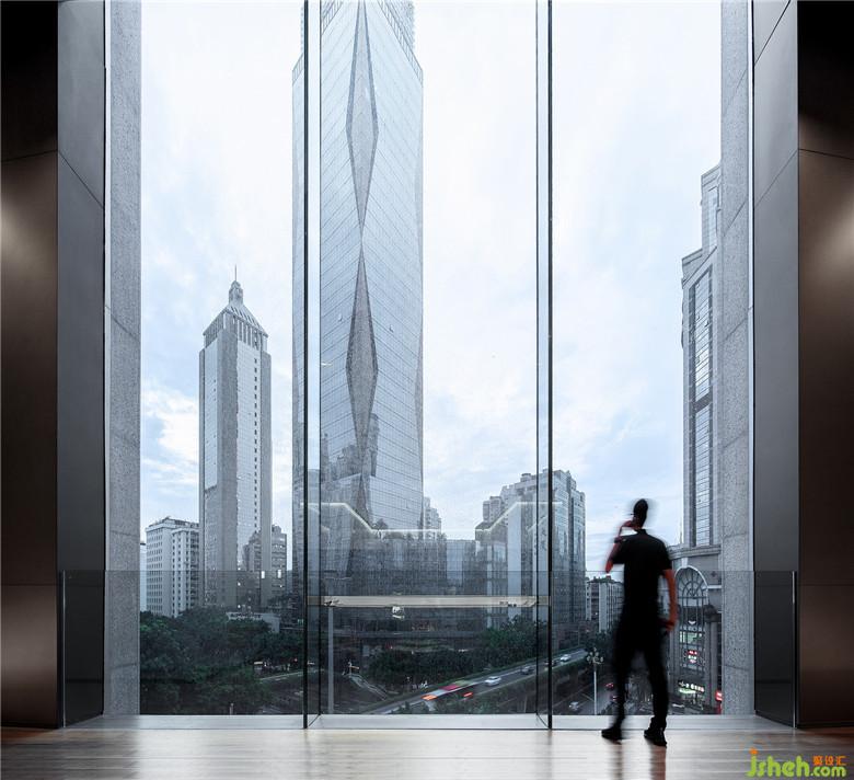 透過(guò)通透玻璃幕墻,這塊獨(dú)特的空間被向外進(jìn)一步延伸,與自然環(huán)境之間有了更深刻的關(guān)聯(lián)。由內(nèi)向外望去,它像在隔絕空間里被注入的一次深呼吸;而站在大廈之外,它就像是一個(gè)鑲嵌在空中的巨大櫥窗,在溫暖的燈光的映襯下,猶如這座屹立了20年的建筑終于向城市打開了自己的內(nèi)心世界。