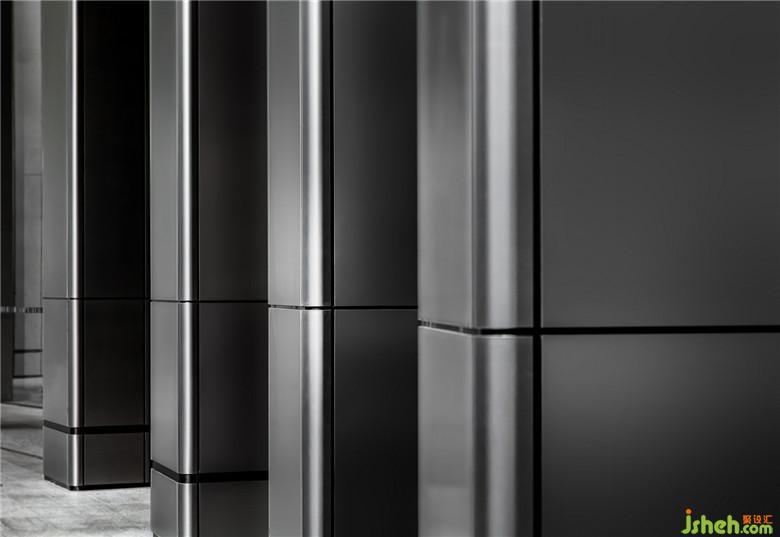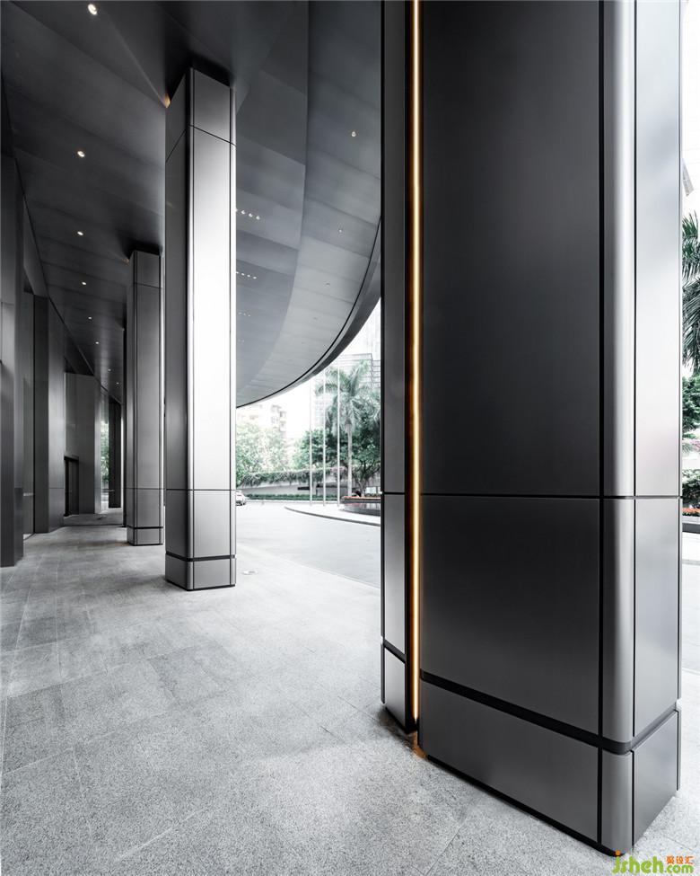 立柱之上雨篷則被重新設計,簡潔的弧形結構替代了原本的玻璃雨篷,結構的簡化讓它與大廈主體間的銜接更加自然,融為整體。同時,半圓弧形結構向兩側的自然延伸帶來了更多的覆蓋面,為遮擋功能帶來提升。