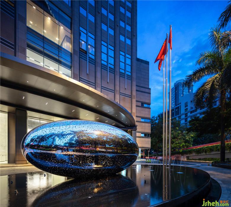 一樓大堂門前的巨蛋雕塑,源自藝術家Lindy Lee,6米不銹鋼材質的體量感,不容忽視,通體布滿細小的孔,黑暗中,它們會穿透蛋殼,投射出星辰般的光芒,讓人看到有無限的能量在迸發(fā)。如果說這棟大廈曾是一個過往的城市象征,那經歷過重塑后的它,應當是“孕育”在蛋殼的一束光芒,繼續(xù)點亮門前這條大道。