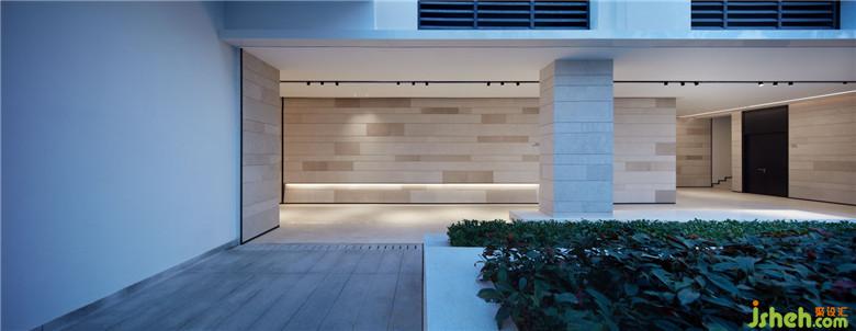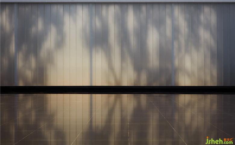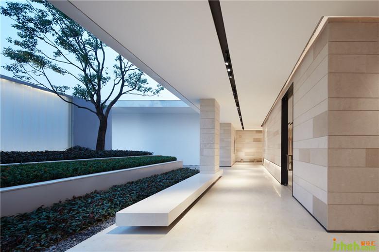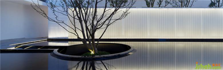 穿過連接前廳與后廳的連廊,一簇枝椏立于水面,身旁墻面素凈,背后天空寂遼,不大的天地方寸間卻為它留下了的無限的空白與想象,在水面的倒影里彷佛有寂靜的詩意在低語。