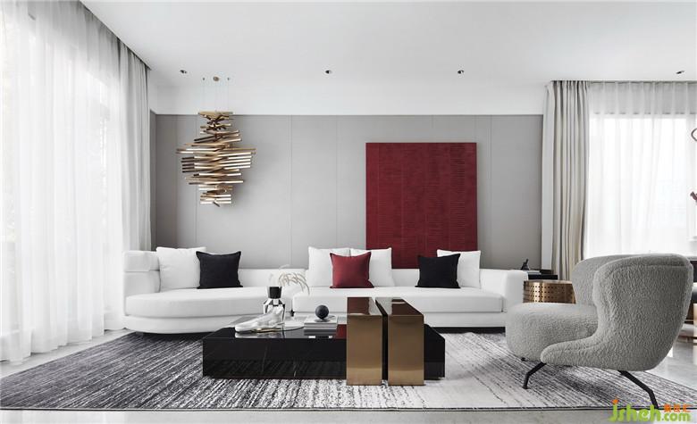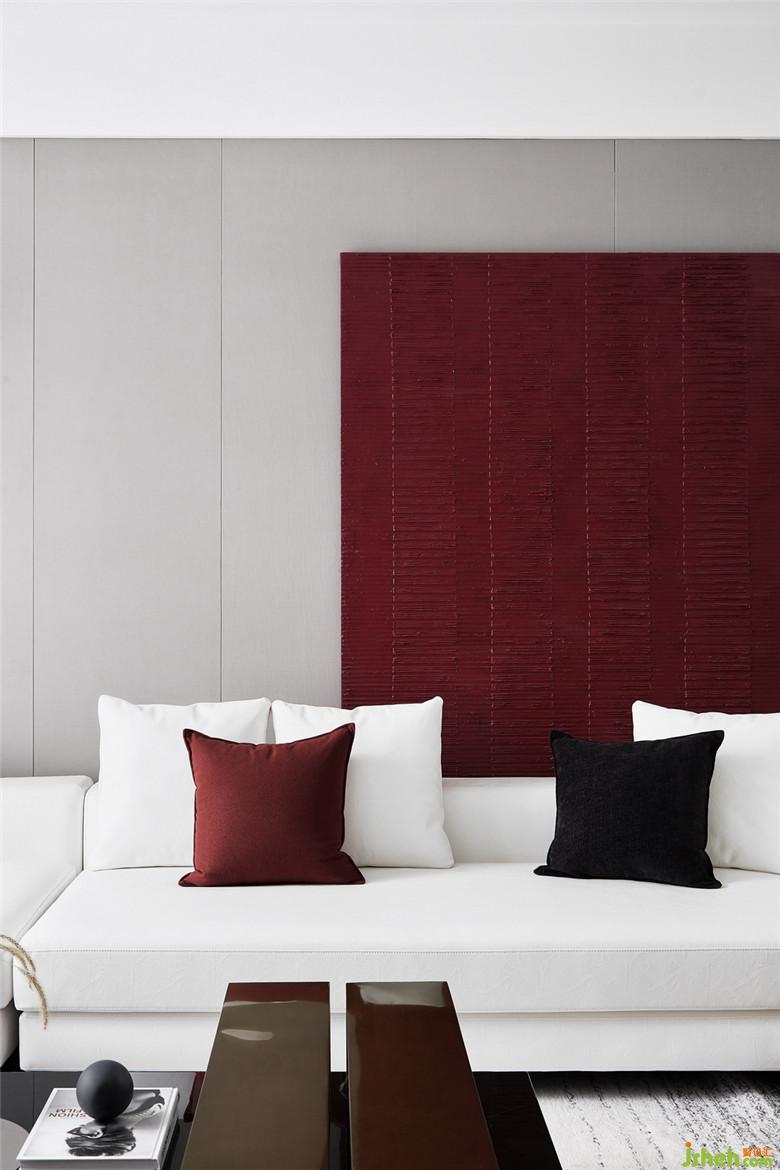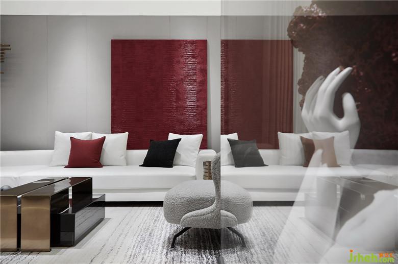 濃烈的紅以不同的材質(zhì)導(dǎo)入,貫穿于客餐廳的不同塊面,不同灰度的黑與白,用肌理感強(qiáng)烈的棉麻、絨布材質(zhì)間序其中,金屬的光澤以線條的形式介入。