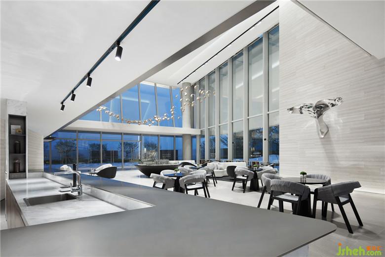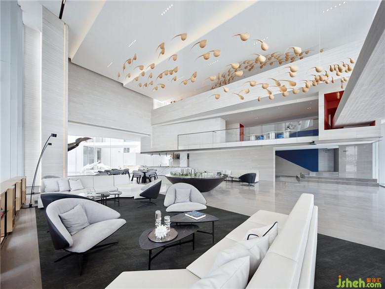 延續(xù)建筑輕盈、現(xiàn)代的語匯,設(shè)計以“海、天、云”這種在地的自然形態(tài)作為出發(fā)點,在空間內(nèi)部運用堆砌、切割、錯置空間體塊等內(nèi)建筑概念手法,切入簡潔而富有創(chuàng)造性的輕盈體塊,在線條與體面關(guān)系上不撕裂建筑形態(tài)的基礎(chǔ)上,將建筑舒緩地延伸進室內(nèi)。原質(zhì)材料的白與輕度灰金屬在不同的光線變化中表達出“海、天、云”的情態(tài)關(guān)系,從而形成建立整個空間秩序的設(shè)計線索。