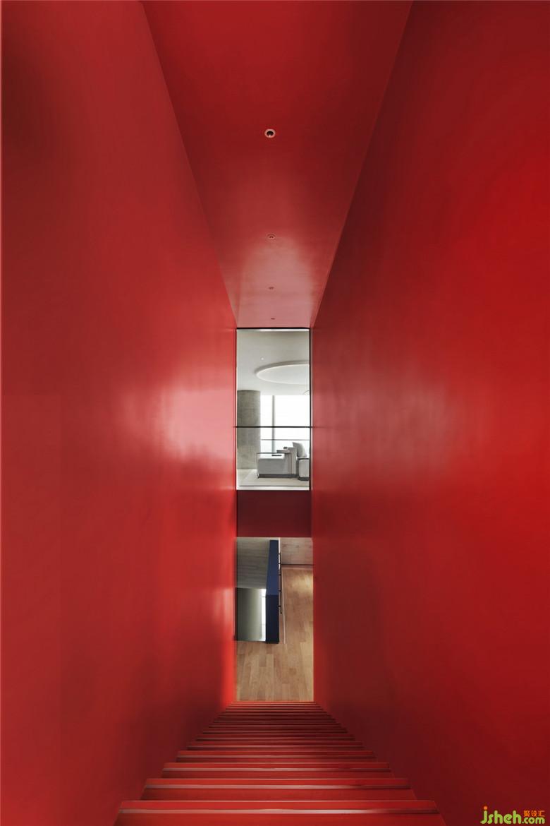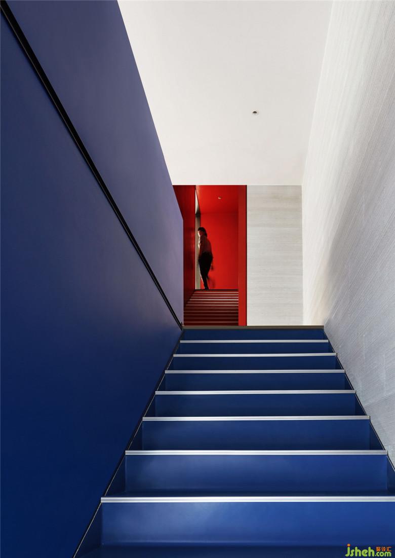 在二層洽談區(qū),我們通過增加夾層樓梯空間連接了三層的兒童活動區(qū)與咖啡吧,并與開放式的戶外屋頂結(jié)構(gòu)一同作為一種開放式櫥窗形態(tài)展示給來者。同時,為平衡空間整體灰白主色調(diào)營造的過于空曠的觀感,在二層及三層的多個區(qū)域,我們以獨立的大塊面紅、藍原色作為空間調(diào)節(jié),通過墻體前后塊面的錯落與色彩搭配,使空間層次得到豐富。