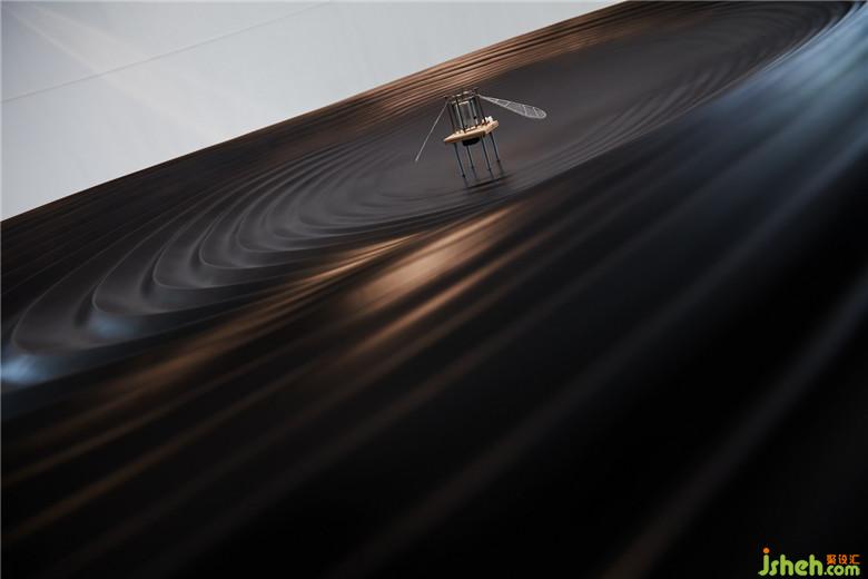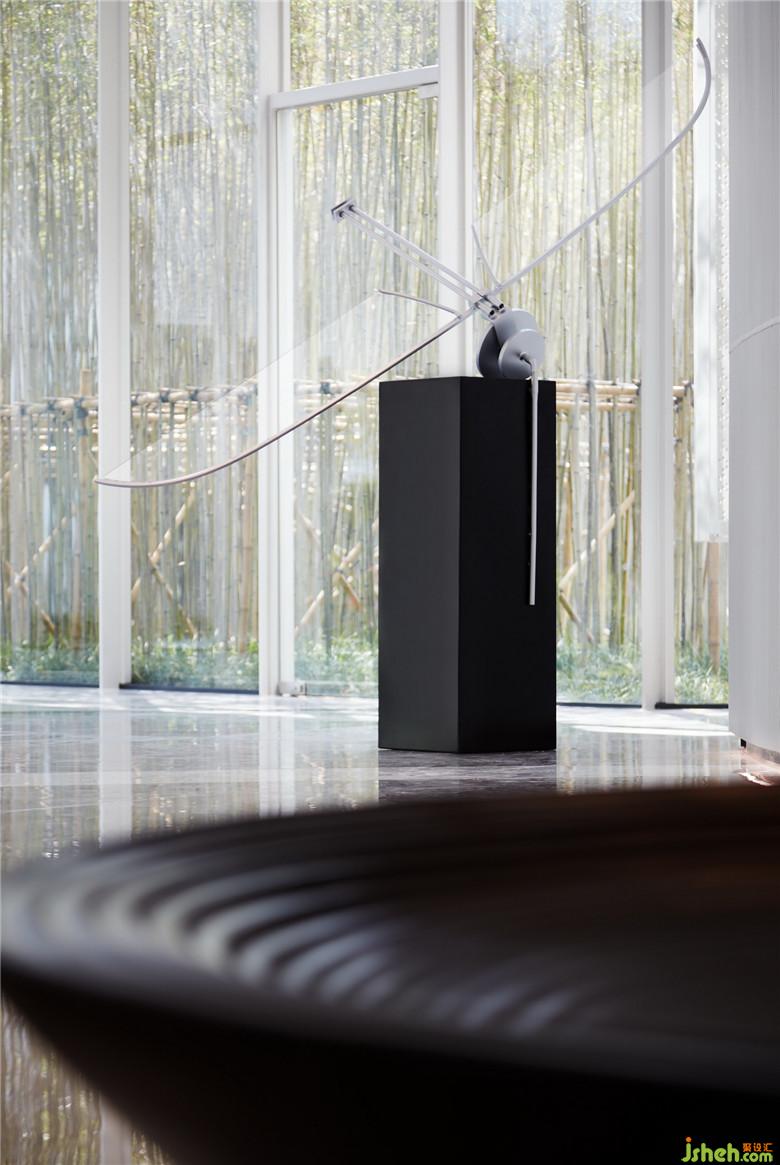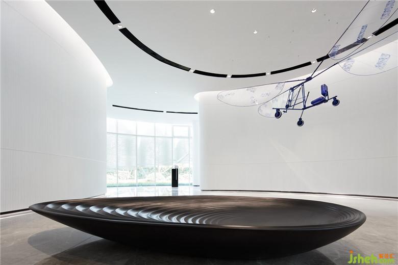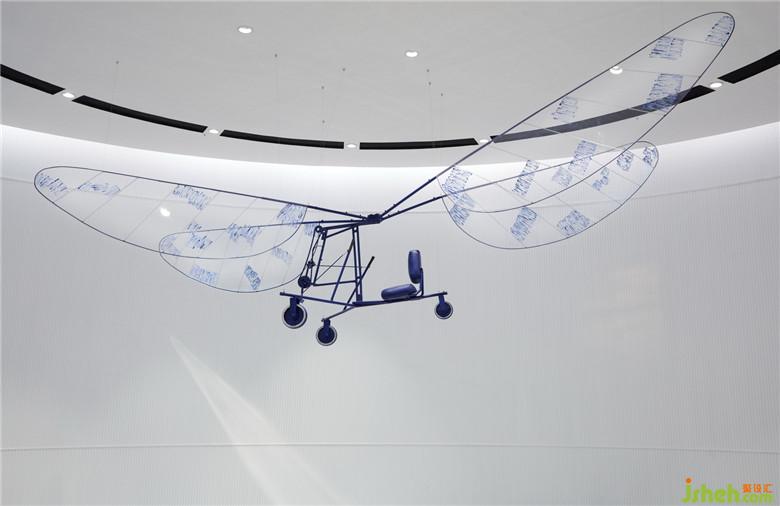 當(dāng)天空邂逅科技,飛行是永恒的旋律。共生形態(tài)以“飛行”為線索挑選相關(guān)藝術(shù)品與裝置,并以之關(guān)聯(lián)、穿透各個空間,形成清晰的導(dǎo)向系統(tǒng)。從前臺接待、區(qū)位展示、多媒體室到藝術(shù)長廊,空間層層遞進,故事逐次展開:前臺錯位懸掛的燈具,精美的圓形結(jié)構(gòu)宛如片片云朵漂浮,奏響空間序曲;環(huán)形幕墻下擺放的魔法飛行器,啟發(fā)觀者產(chǎn)生聯(lián)想;天花上的弧形燈槽似飛行的軌道,而大型飛行器就懸于半空;藝術(shù)長廊擺放著各式熱氣球及飛行裝置模型,墻身的手稿畫、黑白照片記錄著其誕生的歷史;沙盤區(qū)上方設(shè)置藍色天鏡裝置回應(yīng)“天空”主題,鏡面反射作用突顯了整體空間的未來科技感,使每個區(qū)塊都有了特有的影子,形成空間獨有的記憶點。會所設(shè)計