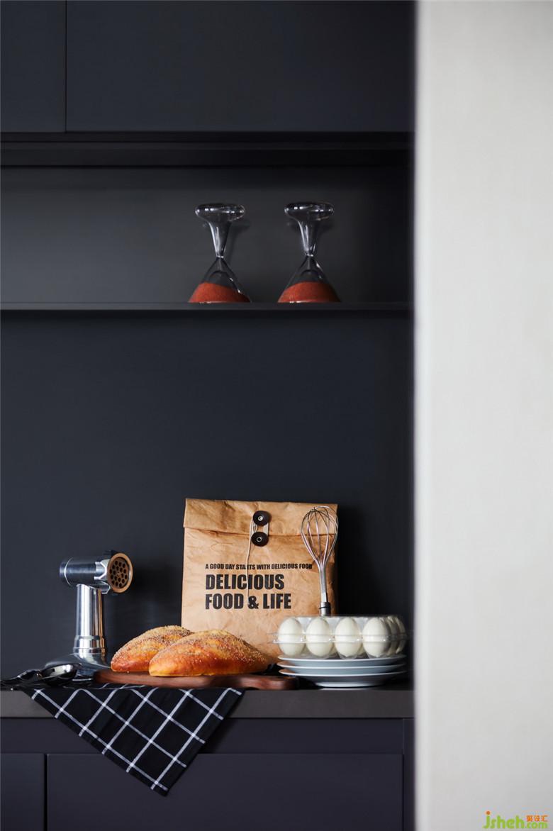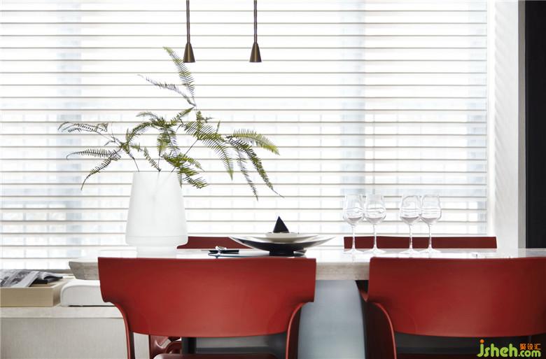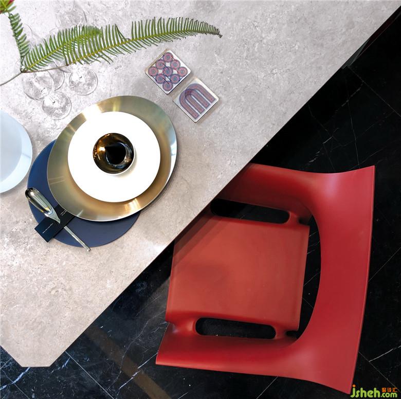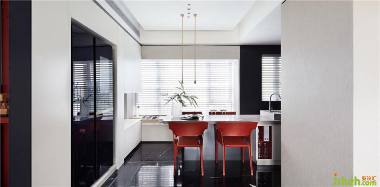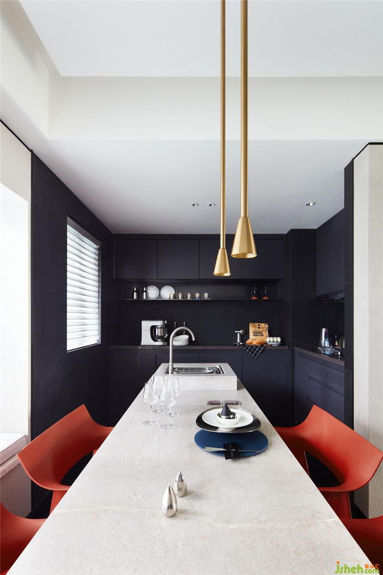 開放式廚房與餐廳二合為一,它們與沙發(fā)區(qū)相對,建構(gòu)出一個(gè)歡快交融的互動性起居場景。紅藍(lán)主調(diào)的空間配色使人想起蒙德里安的風(fēng)格派畫作,強(qiáng)烈原色的構(gòu)成中暗含生活邏輯。