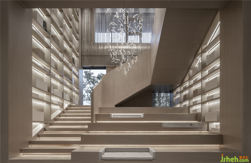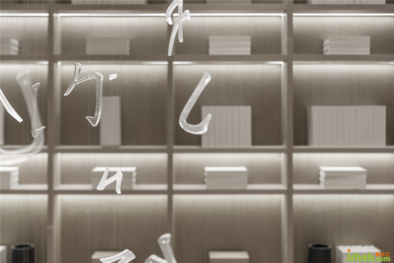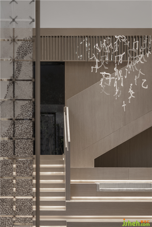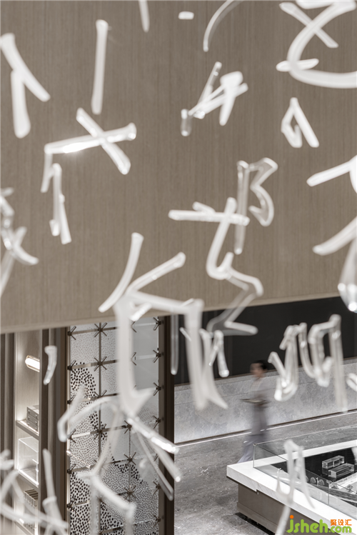 溫嶺地處溫黃平原,四山一水五分田的地貌,孕育出當(dāng)?shù)厝说纳罹爸屡c傳統(tǒng)風(fēng)俗。得靈感于此,三盛璞悅府銷售中心,入口玄關(guān)墻如海中山島,將空間如畫卷般橫向展開,而梯間懸吊的文字圖騰又將空間向上拉升與引導(dǎo),橫、縱向空間層次得以擴(kuò)展,人的視線亦因之得以拓寬。