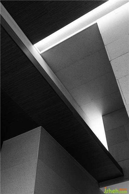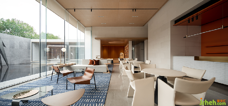 泉眼流水落在水面上,形成一片光影錯動,倒映天花之上,形成另一番生動的景致。木色天花如同嵌于天上的水道,將人的視線引向空間深處。