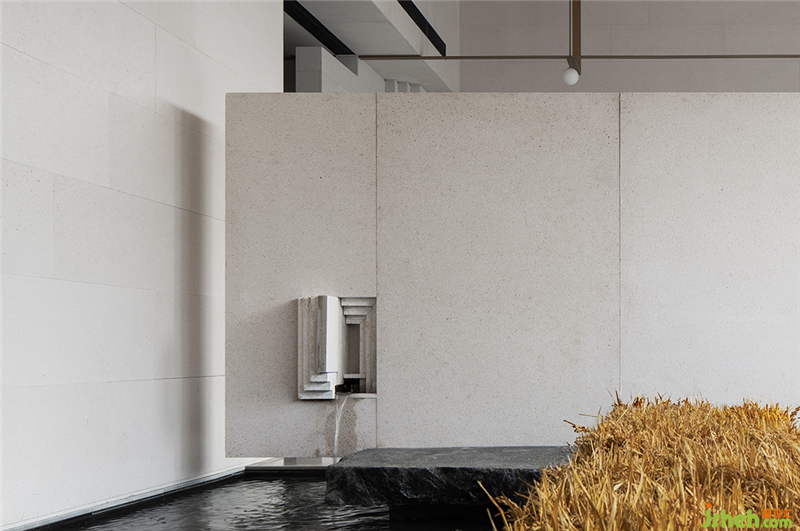 泉眼潺潺,曲渠鱗鱗,與室外的池景連成一片水域。釀黃酒的稻米與重達數(shù)噸的黑山石安置室內(nèi),傳遞關(guān)于時間的詩意。展廳裝修設(shè)計浪淘猶見天紋在,一石攬盡太古風。巖石的肌理藏著時光流逝的聲響與印痕,潛移默化將觀者帶入意境之中。
