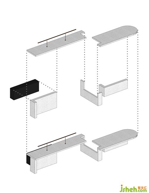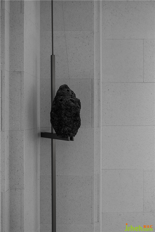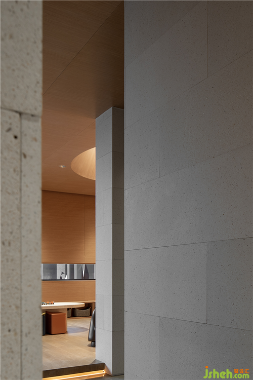 從原石,到半成品石,再到人造石板,銷(xiāo)售中心設(shè)計(jì)師以材料建立起三重時(shí)間的演進(jìn)。接待臺(tái)的磚體晶瑩里泛一點(diǎn)黃,如同稻米映照在陽(yáng)光之下。磚體相對(duì)脆薄,采用室內(nèi)裝修的手法拼砌,磚體必不能承其重,因此改用建筑手法排砌,意外使得磚體質(zhì)感更顯。走廊轉(zhuǎn)角處,設(shè)計(jì)師原想開(kāi)一個(gè)面東的天窗,讓光影可以流轉(zhuǎn),囿于客觀條件未能實(shí)現(xiàn)。改而研發(fā)出一種水泥板,以創(chuàng)造從明亮到柔和的漫反射光線。水泥板采用交錯(cuò)咬合的方式搭砌,交接處可清晰見(jiàn)到材料的厚度。