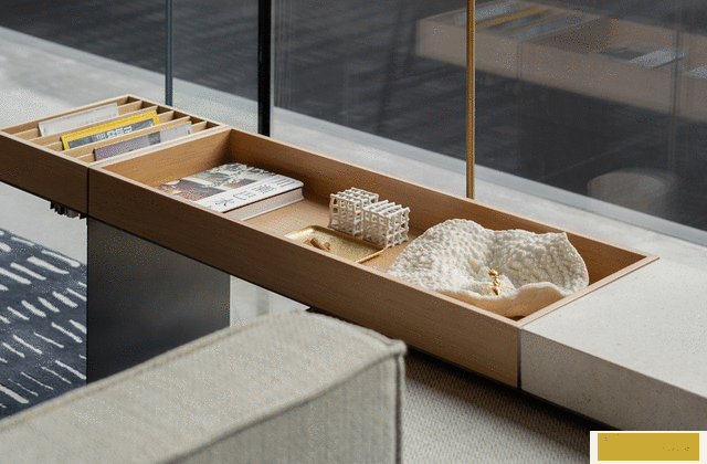 室內(nèi)空間近似長(zhǎng)方體,設(shè)計(jì)師以一條強(qiáng)制性動(dòng)線漸次展現(xiàn)空間全貌,如同水流引導(dǎo)觀者自主到達(dá)下一個(gè)區(qū)域,消解室外進(jìn)入路線帶來(lái)的迂回感??臻g的比例與構(gòu)成運(yùn)用模數(shù)化手法,盡量破除非自然的對(duì)稱(chēng)序列。以建筑的手法設(shè)計(jì)空間,設(shè)計(jì)師瞄準(zhǔn)的是構(gòu)成與建造之美。比如前廳兩根承重柱對(duì)人的運(yùn)動(dòng)會(huì)產(chǎn)生阻礙感,設(shè)計(jì)師將之組織到空間秩序之中,通過(guò)透視關(guān)系將其用作框景構(gòu)件,錨定空間序列。
