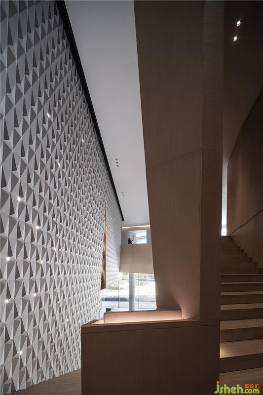 整個(gè)接待區(qū)域的墻面如折紙模型般含吮著光線,淺色水泥材質(zhì)以起伏制造出有如折痕的明暗。