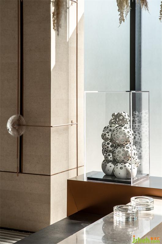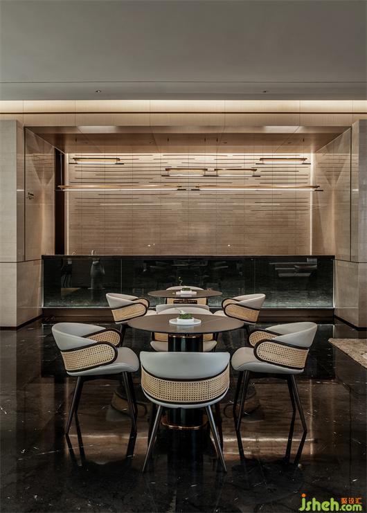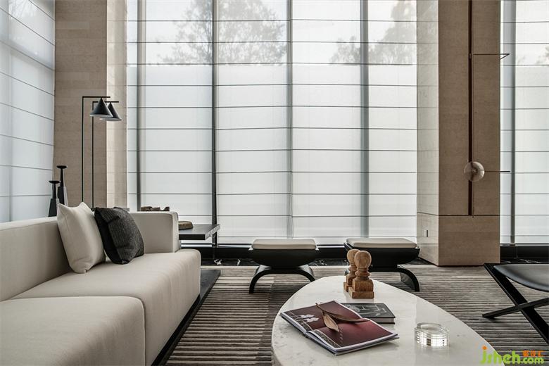 公區(qū)設(shè)計(jì)師確立了以水為線索、用材質(zhì)對(duì)比在空間中表達(dá)出溫潤和有人情味的生活氣息,用酒店大堂的視覺感受體現(xiàn)出生活品質(zhì)的設(shè)計(jì)策略。