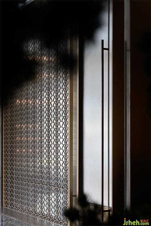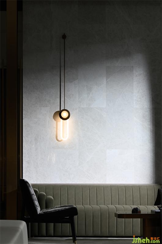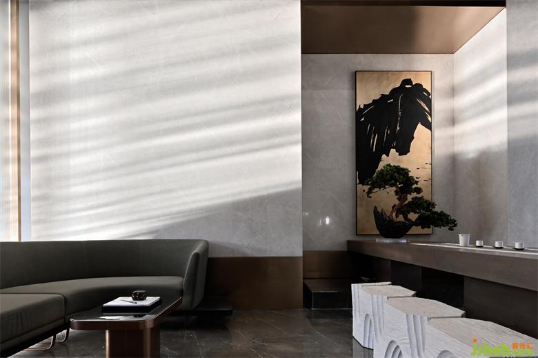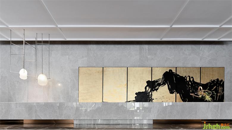 運用深淺兩種石材營造傳統(tǒng)水墨畫中虛實濃淡的視覺感知意境,呈現(xiàn)出一種儒雅式的靜謐。而工藝玻璃與霧化金屬的應用,則給空間平添了幾分現(xiàn)代美學氛圍與輕奢品質感。