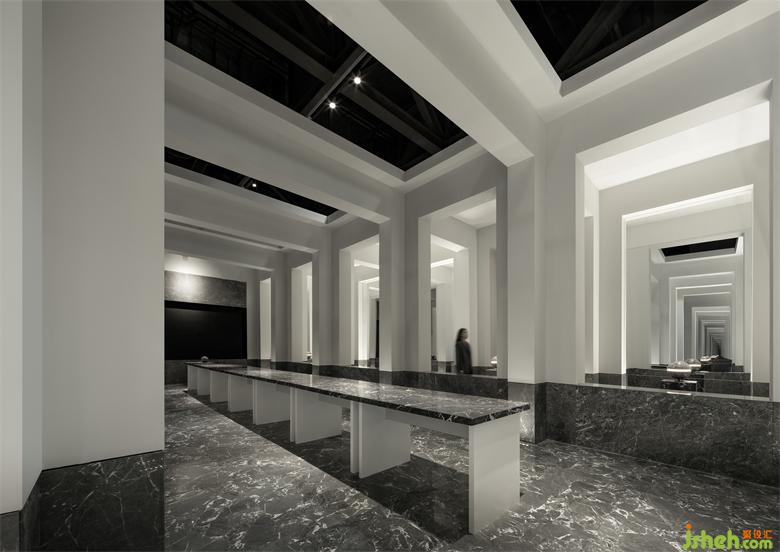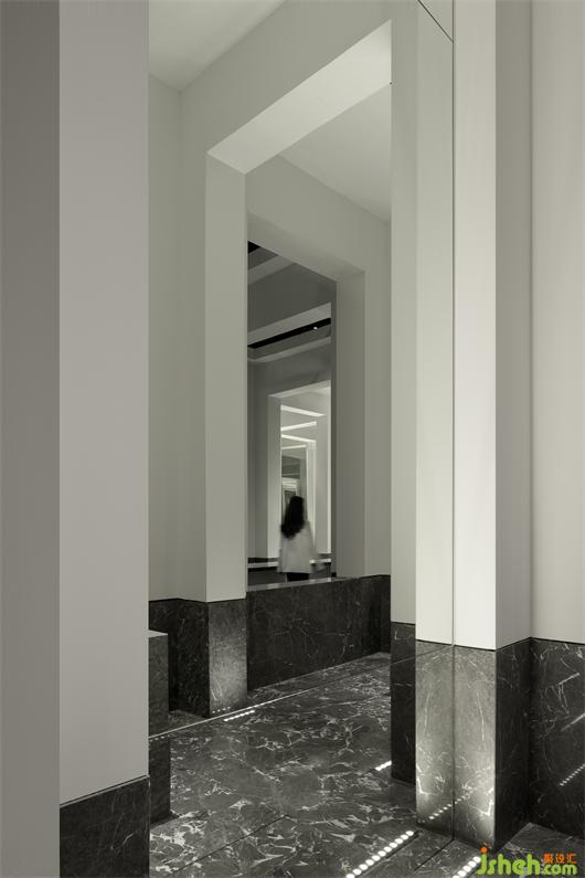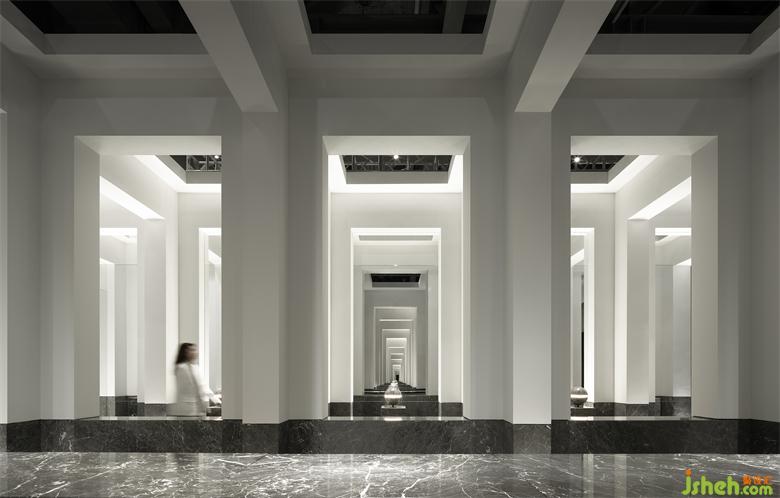 受帕特農(nóng)神廟空間構(gòu)成的啟示,展廳平面的核心空間與外圍廊柱形成一種神圣的陣列,展廳設(shè)計(jì)中軸對(duì)稱的布局展現(xiàn)出豐富的空間層次。行進(jìn)流線區(qū)域間放置的大理石裝置對(duì)應(yīng)著石材的未來(lái)感,在框景之中,為空間與人的交流、互動(dòng)罩上一層神秘色彩。