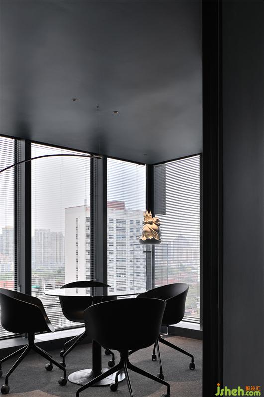 辦公總部設計在平面布局中,白色沙發(fā)以反常規(guī)的方式背靠橫向延伸的辦公桌一端,形成中島組團結(jié)構(gòu),既使得空間秩序干凈明確,也為入口留出充足的動線空間。