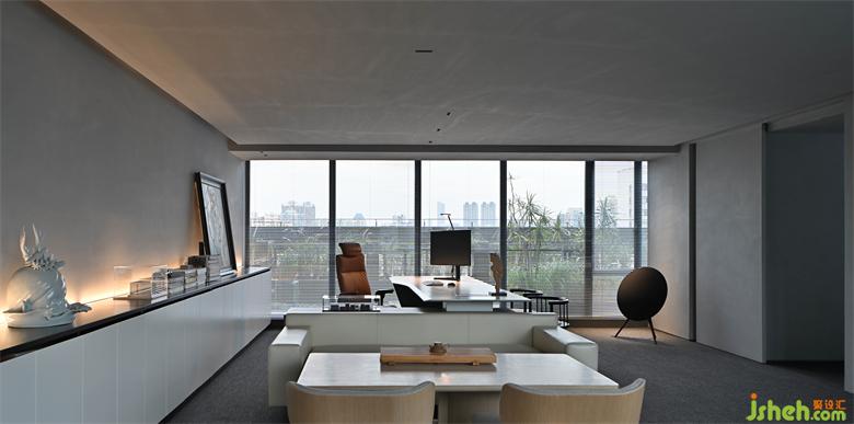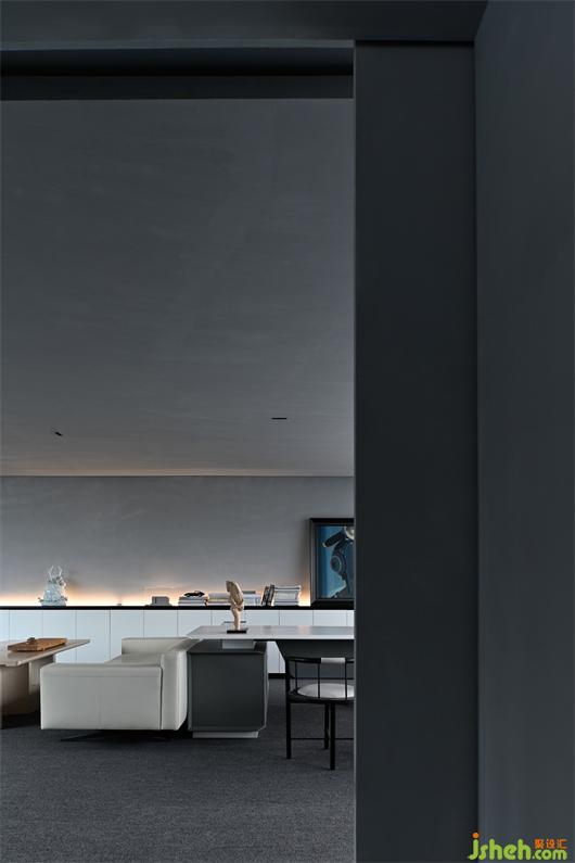 如此,辦公總部設(shè)計(jì)以灰色的推拉門(mén)為界,將日常的辦公區(qū)域退守在相對(duì)規(guī)整的梯形空間之中,消解三角結(jié)構(gòu)對(duì)空間感受力的干擾。