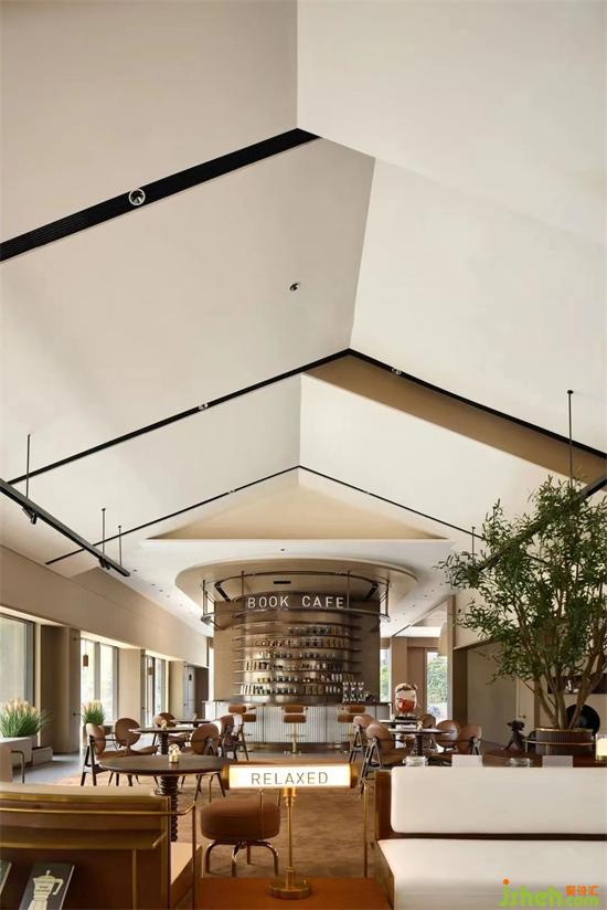 空間之中兩株直通頂部的樹形成了軟裝關系的中心,圍繞著兩棵樹,形成了各自的交談場景。銷售中心設計坐在其間,仿佛歲月穿梭,拉回到曾經在樹下捉蟬,彈彈珠的時光??臻g與人、人與人的距離迅速被拉近、包裹。