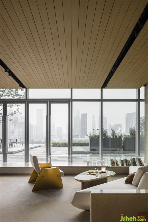 戶外露臺的設(shè)計圍繞樹與城市景觀,布置沙發(fā)座椅,構(gòu)造樹下多維社交集會空間。天際會所設(shè)計露臺式屋頂?shù)挠行н\用,可以供人穿行使用,“屋頂平臺”就此誕生。如何聯(lián)系起屋頂平臺和室內(nèi)空間是設(shè)計的關(guān)鍵。