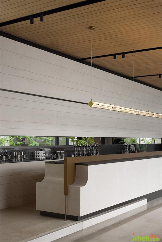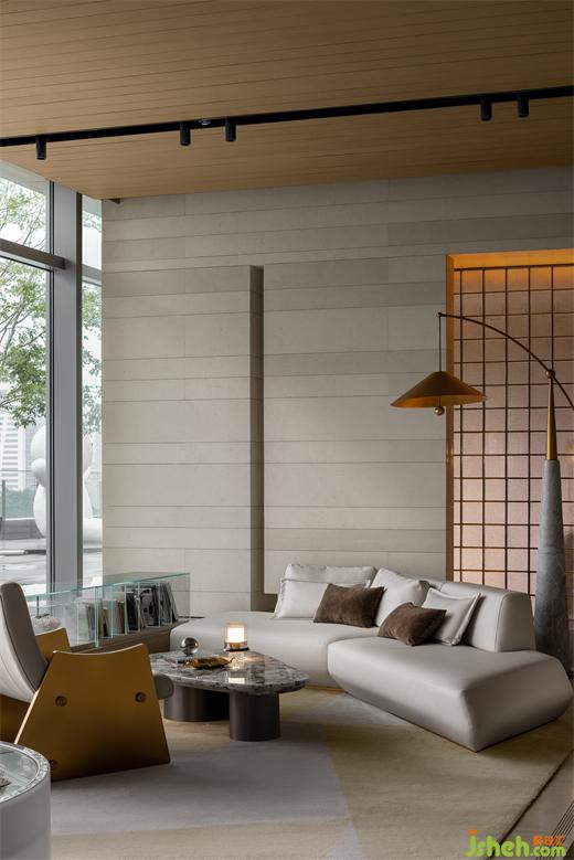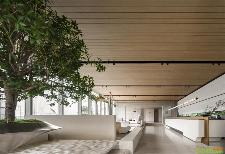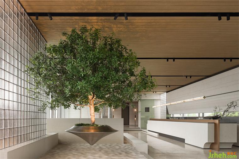 暖黃的燈光與溫和的石材在前廳接待臺彌合出一種謙和的氛圍。天際會所設(shè)計半隔斷的玻璃墻帶著些許氤氳,目光盡端以自然植被的綠色拉長了對視線的吸引,喚醒城市旅人記憶中的某個瞬間,從而誘出情緒。