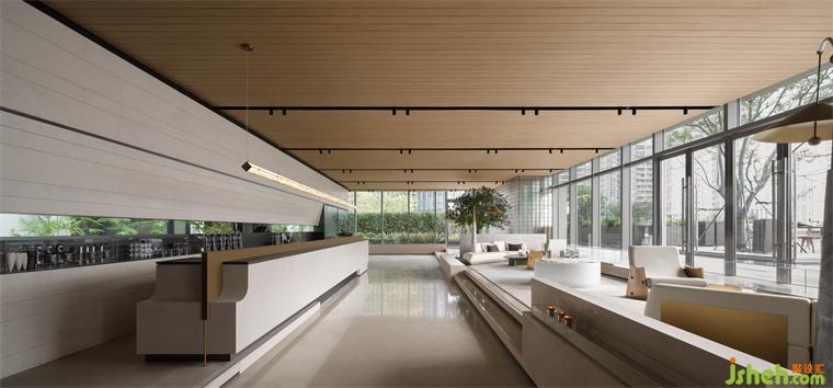 洽談區(qū)域在此形成一種觀望方向上的轉(zhuǎn)變,同時以整體抬高的尺度變化與戶外平臺相互呼應(yīng),猶如一個以城市天際線為背景的舞臺,將城市中軸的絕佳輪廓呈現(xiàn)。