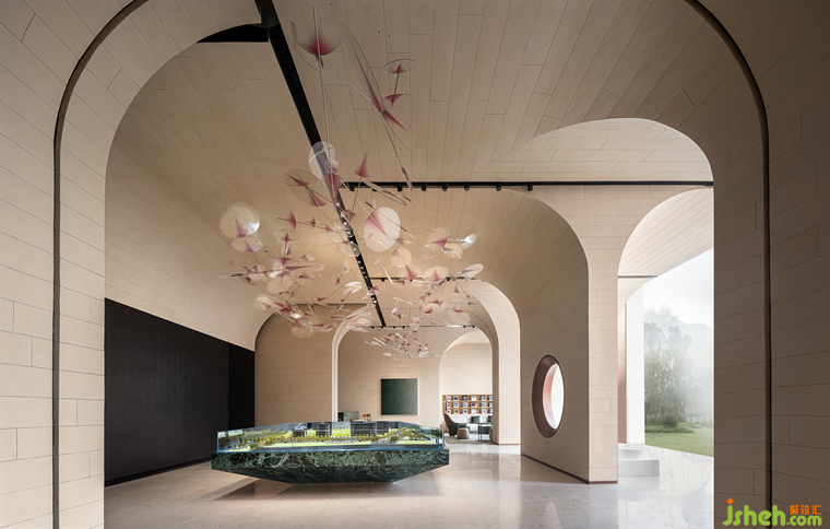 因此在概念上,由生態(tài)環(huán)境進(jìn)行切入,提取出一系列貼切有效的自然元素,并充分結(jié)合原本場(chǎng)地為住宅架空層的原始條件,以“森林會(huì)客廳”為概念、以“林中漫步”為主體場(chǎng)景的售樓部,便成了最精準(zhǔn)的空間意向性表達(dá)。